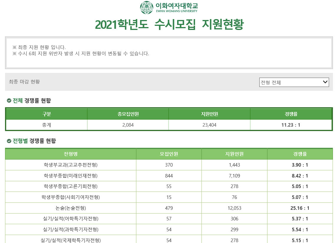 최종 마감 현황 전형 전체 학생부교과(고교추천전형) 학생부종합(미래인재전형) 학생부종합(고른기회전형) 학생부종합(사회기여자전형) 논술(논술전형) 실기/실적(어학특기자전형) 실기/실적(��