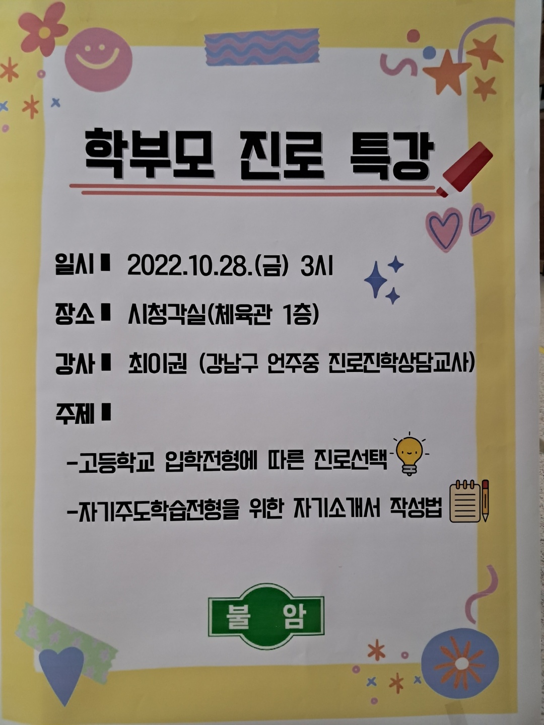 | 성신여중 고입설명회 밎 합격 자소서 특강 (0) | 2022.10.13 |