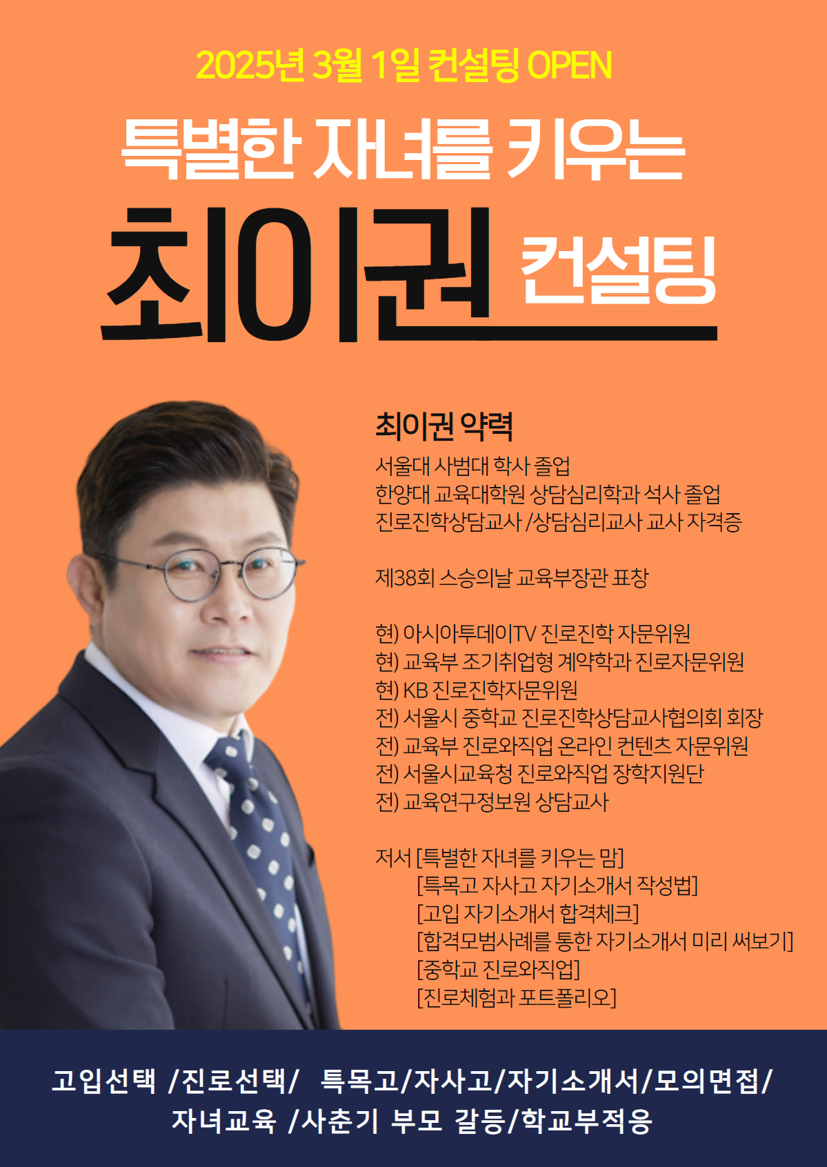 ❤️ 최이권 소장 컨설팅 분야 ❤️ ▶️ 진로계열선택/직업선택/특목고/자사고/자기소개서/모의면접/자녀교육/사춘기/친구/왕따/주의산만/부모갈등/
