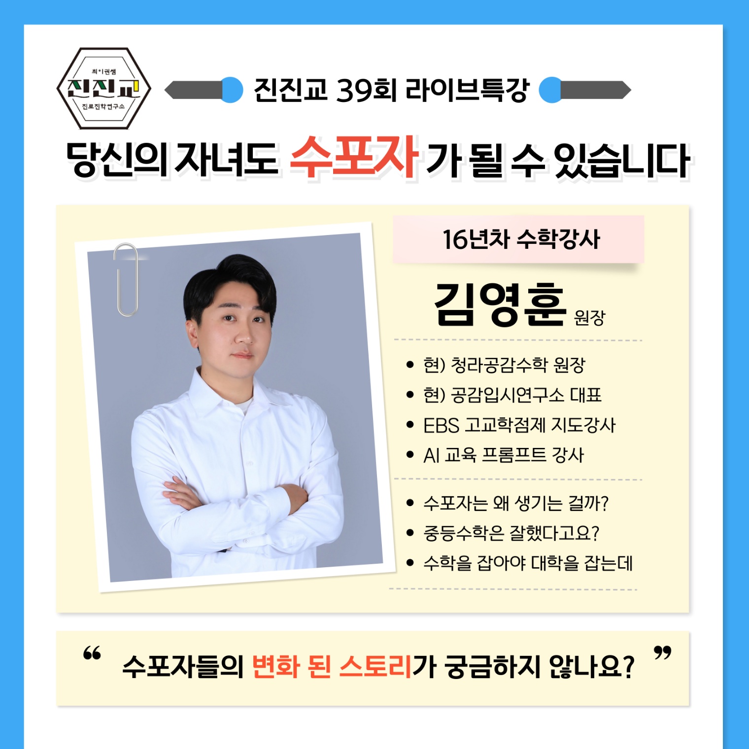 카테고리 없음 특강신청)당신의 자녀도 수포자가 될 수 있습니다 by 최이권쌤의 진로진학연구소 2025. 6. 26. https://www.choischool.com/특강신청 최이권쌤의 진로진학연구소진진교는 선한 영향력으로 운영위원 학부모님들과 전문위원들이 함께 만들어가는 교육 불평등 해소를 위한 입시 교육 봉사 모임입니다.choischool.com 공유하기 게시글 관리 최이권쌤의 진로진학연구소