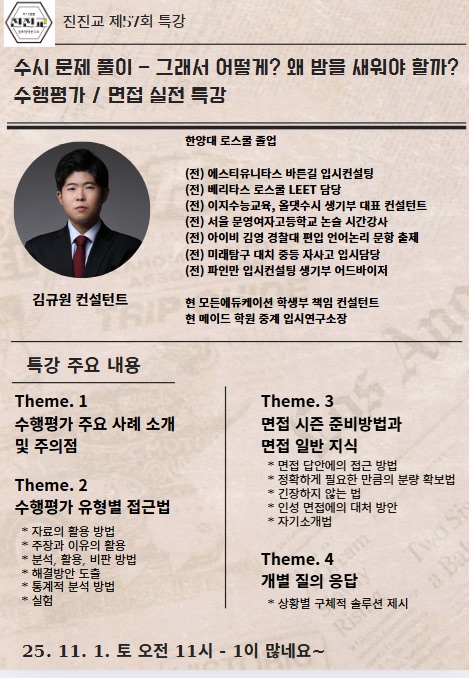 | 진진교 73회 라이브 특별 특강 ✴️ [최이권쌤 진로진학연구소 특별 강의 시리즈] (0) | 2026.02.13 |