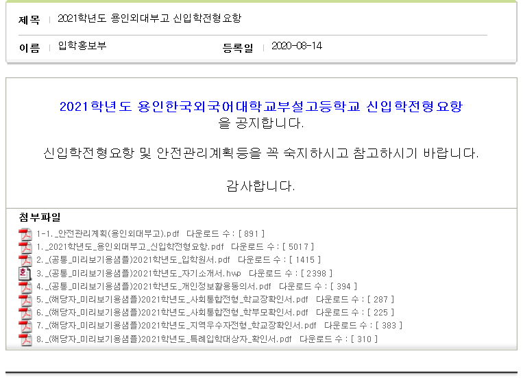 2021학년도 용인한국외국어대학교부설고등학교 신입학전형요항 을 공지합니다. 신입학전형요항 및 안전관리계획등을 꼭 숙지하시고 참고하시기 바랍니다. 감사합니다.