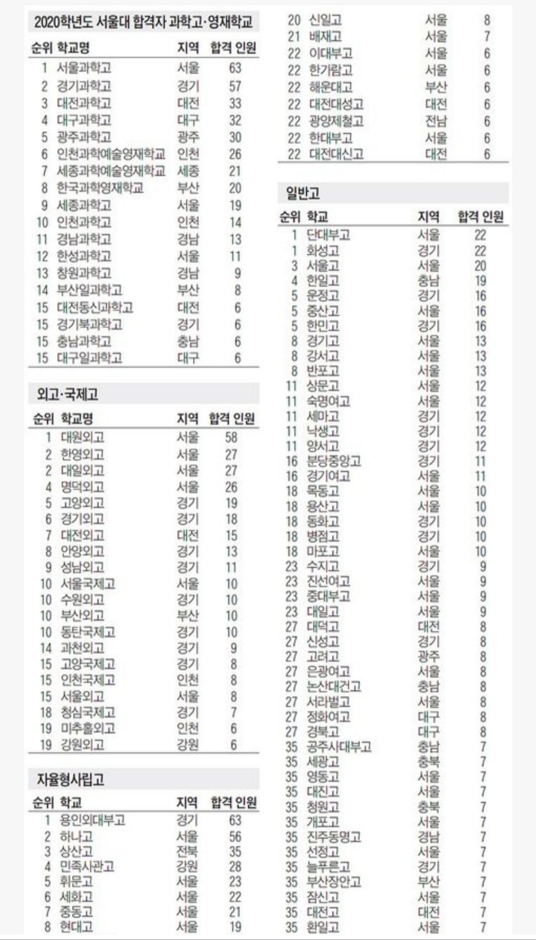 2020학년도 서울대 입시에서 합격자를 20명 이상 낸 고교(예체능 제외)가 22곳으로 집계됐다. 전국 고교(2360곳)의 0.9%다. 과학고·외국어고 등 특수목적고, 자율형사립고(자사고), 영재학교가…