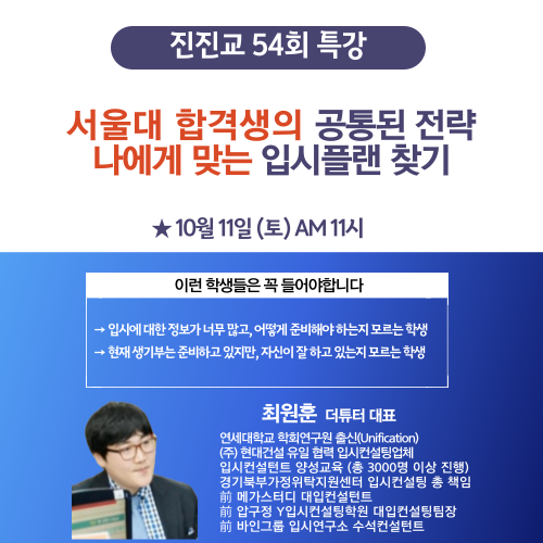 ✴️ 54회 진진교 라이브 특강 ✴️ 🌟 특강 제목 : 서울대 합격생의 공통된 전략 <나에게 맞는 입시플랜 찾기>