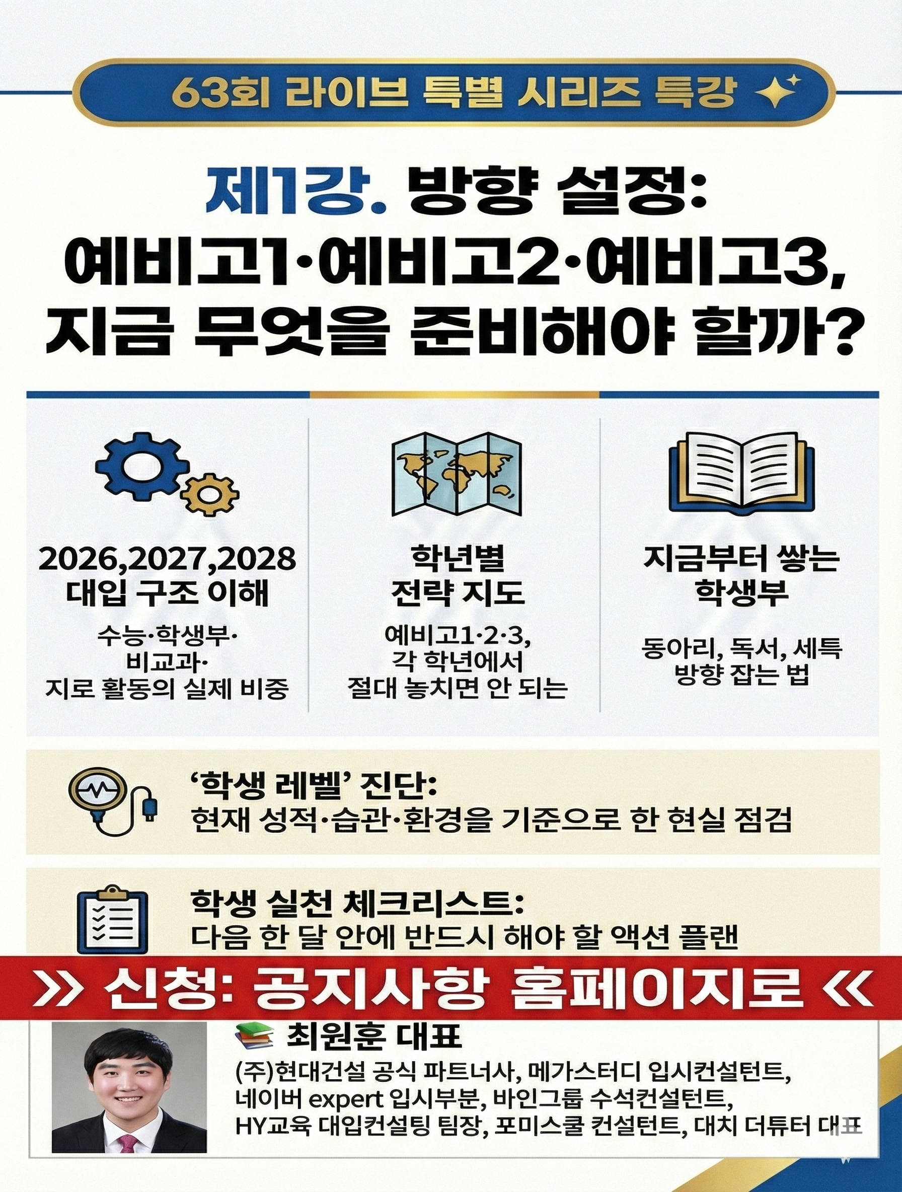 카테고리 없음 제 63회 라이브 특별 특강 신청 최이권쌤의 진로진학연구소 2025. 12. 7. 09:44 https://www.choischool.com/특강신청 최이권쌤의 진로진학연구소진진교는 선한 영향력으로 운영위원 학부모님들과 전문위원들이 함께 만들어가는 교육 불평등 해소를 위한 입시 교육 봉사 모임입니다.choischool.com