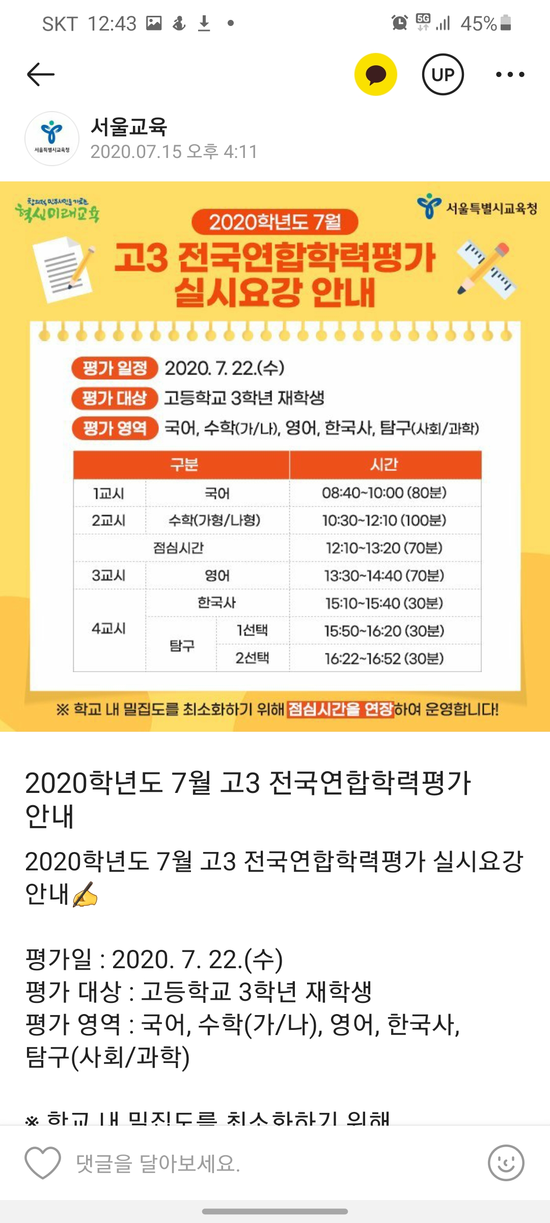 ■ 고입 대입 정보/└ 진로진학정보 고3전국연합학력평가 안내 최이권쌤의 진로진학연구소 2020. 7. 21. 12:46 https://story.kakao.com/ch/seouleducation/GKwJjpToRS02020학년도 7월 고3 전국연합학력평가 안내2020학년도 7월 고3 전국연합학력평가 실시요강 안내✍평가일 : 2020. 7. 22.(수)평가 대상 : 고등학교 3학년 재학생평가 영역 : 국어, 수학(가/나), 영어, 한국사...story.kakao.com