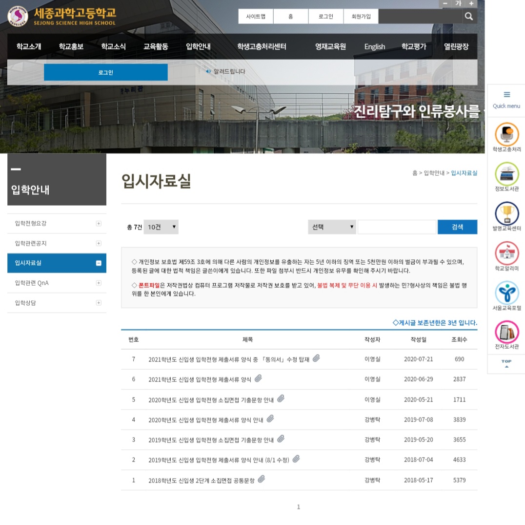 카테고리 없음 21년 세종과학고 입학전형 서류 최이권쌤의 진로진학연구소 2020. 8. 28. 09:47 http://sjsh.sen.hs.kr/109544/subMenu.do입시자료실 | 세종과학고등학교sjsh.sen.hs.kr