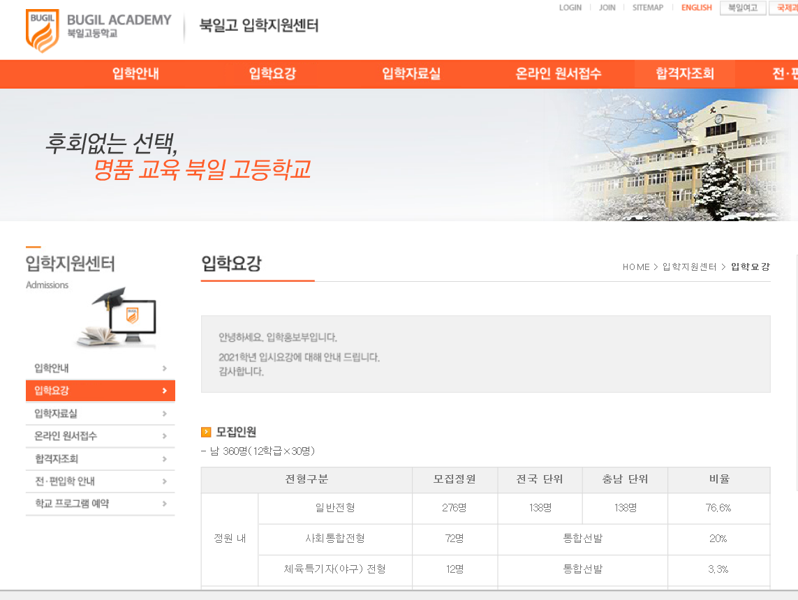 카테고리 없음 2021년 북일고 입학전형 안내 최이권쌤의 진로진학연구소 2020. 9. 10. 10:27 www.bugil.hs.kr/jsp/admission/ad_schedule.jsp 북일고등학교 – 남 360명(12학급×30명) 전형구분 모집정원 전국 단위 충남 단위 비율 정원 내 일반전형 276명 138명 138명 76.6% 사회통합전형 72명 통합선발 20% 체육특기자(야구) 전형 12명 통합선발 3.3% 정원 내 소 www.bugil.hs.kr