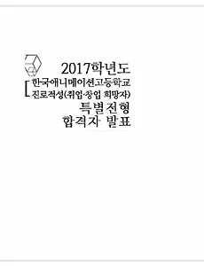 한국애니메이션고등학교3 2017년 한국애니메이션고 합격자 발표 클릭 http://www.anigo.or.kr/main.php?master=popup&act=pop_view2&sid=266 출처; 한국애니메이션고 홈피 2016. 11. 15. 2017년 한국애니메이션고 입학전형 출처; 한국애니메이션고 홈피 2016. 11. 5. 2017년 한국애니메이션고등학교 입학전형 및 성적산출 출처: 한국애니메이션 홈피 2016. 9. 20. 이전 1 다음
