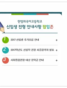 한영외고 최종합격자 발표1 2017년 한영외국어고등학교 최종합격자 발표 여기 클릭: http://www.hyfl.hs.kr/etc/popup4.php?idx=17출처: 한영외고 홈피 2016. 12. 2. 이전 1 다음